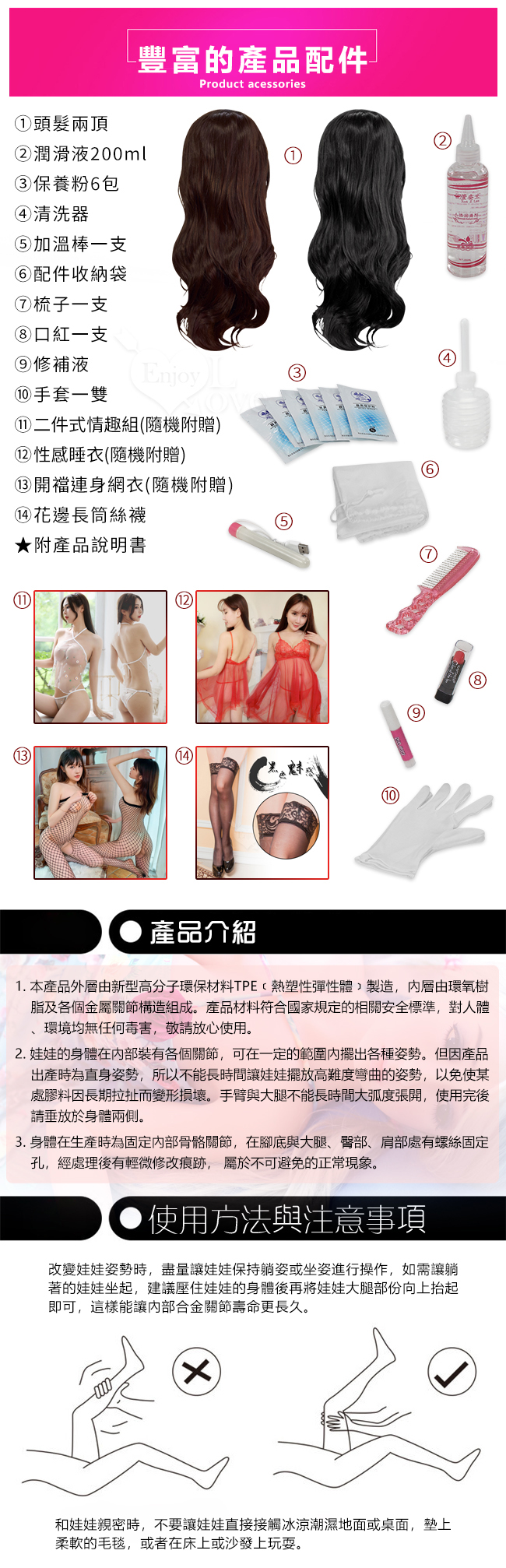 使用部位:陰交、肛交、口交、乳交四種性交用法,內置合金骨骼可固定姿勢,關節可動,可隨意變更姿勢