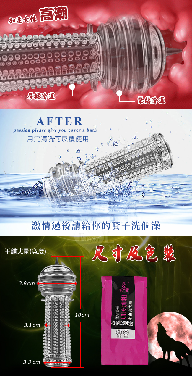 套身佈滿特殊狼牙芒狀設計,保險套的穿戴方式,方便安全,可延伸你的作戰縱深,那些突起的芒刺更能撓動深沉快感,啟發高潮,讓她從此愛你愛到骨頭裏。