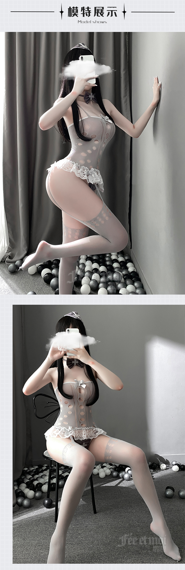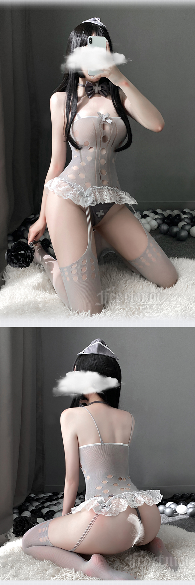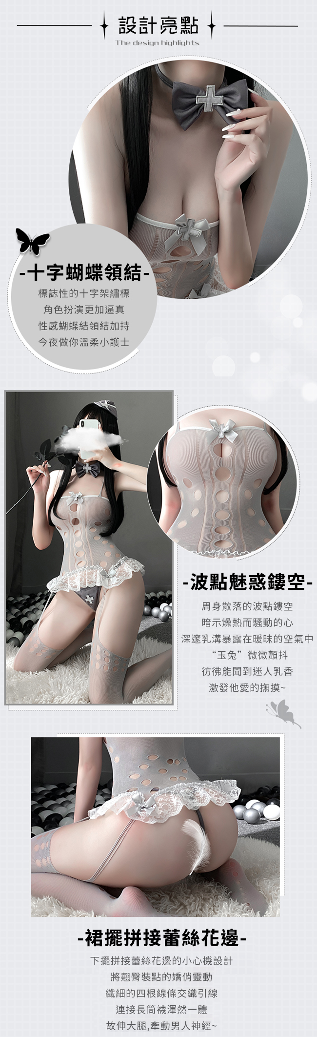 當前位置: 首頁 > 角色扮演服 > 護士系列 > 《FEE ET MOI》護士角色扮演服!十字蝴蝶領結波點鏤空花邊裙襬露臀連身衣四件式套裝